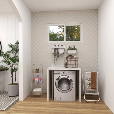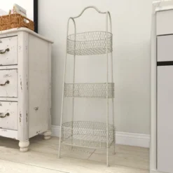 - Features a white finished 3 tier oval basket rack caged with solid framing perfect for home storage and display