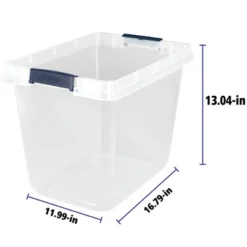 Available in multiple stackable configurations, 29-qt storage bins feature double-rimmed walls to prevent bowing and buckling, while latched handles keep the lids securely attached to the base. What’s more, crossbars built into the plastic containers lids provide an extra level of strength and durability. Perfect for office, workshop, and garage storage solutions. This storage bin is ideal for anywhere you need to stack smart and save space. Interior Base Dimensions: 7.43″W x 11.59″L. Exterior Dimensions: 11.99″W x 16.79″L x 13.04″H.