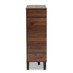 Easily organize your entryway with the generous shelving of the Idina shoe cabinet. Made in Malaysia, the Idina is constructed from sturdy wood in a sleek, modern two-tone walnut brown and gray finish. Five open shelves and five enclosed shelves provide ample space to store up to 15 pairs of shoes. Dark brown splayed legs add a touch of retro charm, while a cut-out handle lends a contemporary look. Requiring assembly, the Idina shoe cabinet is the prime choice for displaying the finest shoe collections.