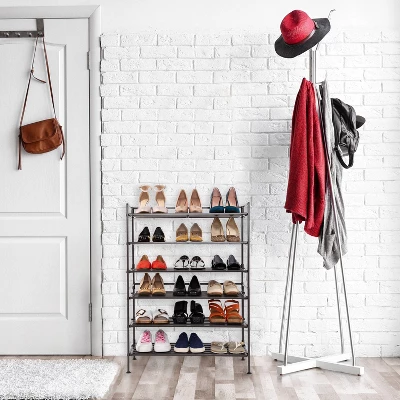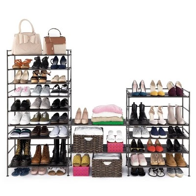 Organize your storage with Seville Classics 3-Tier Stackable Metal Wood Resin Slat Shoe Storage Rack 2-Pack. This versatile storage rack can organize up to 12 pairs of shoes, with 9 pairs of shoes on the shelves and 3 beneath the unit. Shelves are made with woodgrain resin slats in a natural style that fits into any home’s décor. The frame is foldable and made of iron finished in an attractive espresso brown powder coat finish. Store up to 30 lbs evenly distributed across each shelf, or up to 90 lbs. per unit. It’s perfect for storing foodstuffs in the kitchen or pantry, as well as tools and equipment in the garage. Assembly is easy—clip the shelves into the frame and screw in the leveling feet to complete. Stack multiple units (up to 3) for more storage in the same footprint with the included stacking pins. Interlock adjacent units and connect with Seville Classics 3-Tier Resin Slat Tower Shelving (SKU: SHE15882 and WEB146) for a personalized storage system.