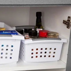 Bring back order to your home and to your life with the Sterilite Medium-Sized Stackable Storage & Organization Basket 20-Pack. The Sterilite Storage Basket is ideal for a wide variety of uses including organizing countertops, kitchen cabinets, pantries, and shelving around the home. Store dry goods in your kitchen pantry, organize supplies in the bathroom or declutter the cleaning supplies under the sink. The contoured handles allow for comfortable transporting, and the smooth finish is easy to clean. Flip down the accent rails to stack several of these indented bins and maximize vertical storage space. These bins are also the perfect size for containing crafting or office supplies. Try integrating the baskets with a bookcase or with opened shelving to tidy up your child’s books, games, or toys. The Sterilite storage bin is great for the garage, crafts, toys, games, and even fresh pantry items too. Anywhere you need to declutter the Sterilite Storage Basket 20-Pack is your solution.